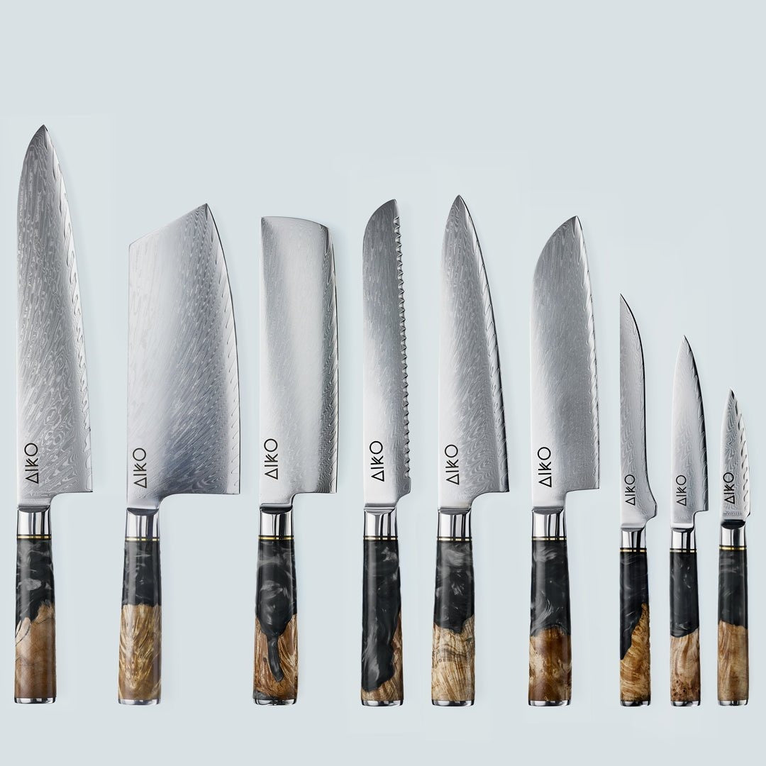 - Unique handle designs crafted from stabilized burl wood and black resin for durability.